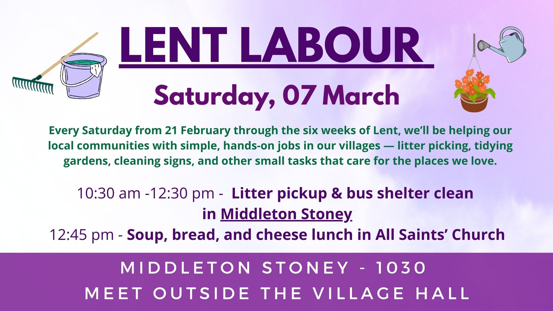 Lent Labour: This year, across our villages, we will be marking Lent with a shared project called Lent Labour. We will be offering a series of simple, practical sessions in each village – litter picking, maybe tidying churchyards and gardens, cleaning signs, and other small tasks that help care for the places we love. Each session will last around two hours and will be open to all, with no special skills required.