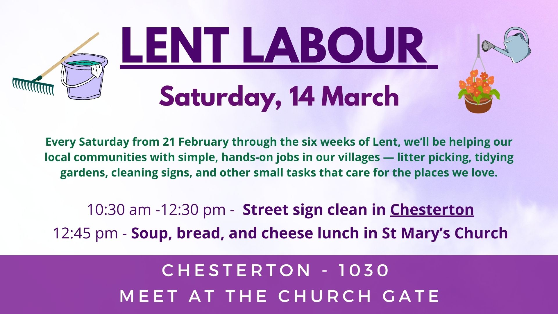 Lent Labour: This year, across our villages, we will be marking Lent with a shared project called Lent Labour. We will be offering a series of simple, practical sessions in each village – litter picking, maybe tidying churchyards and gardens, cleaning signs, and other small tasks that help care for the places we love. Each session will last around two hours and will be open to all, with no special skills required.